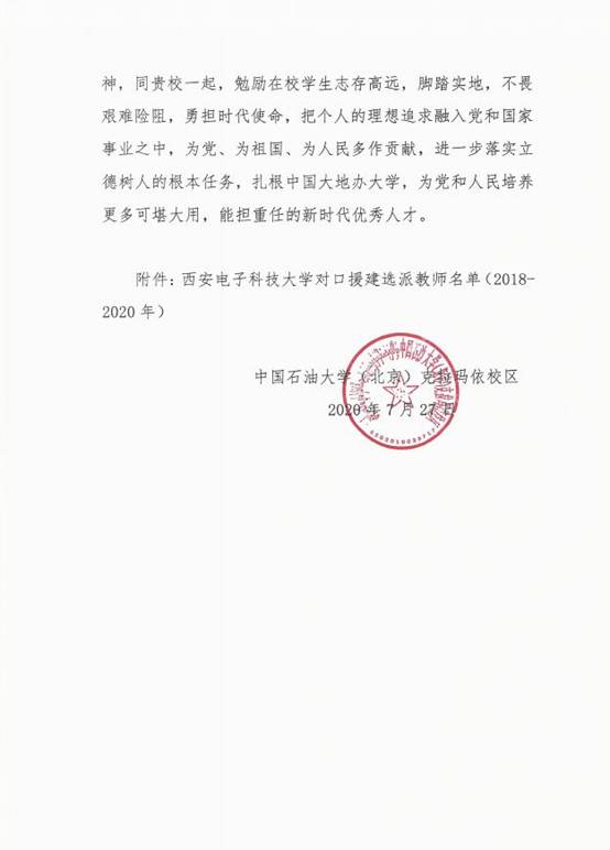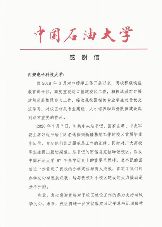 自2018年3月以来,公司牛海军老师、韩宝彬老师相继赴中国石油大学(北京)克拉玛依校区参与对口援建工作,两校在专业建设、人才培养和团队队伍建设方面进行交流学习。为表达对公司鼎力支持与诚挚关心的感谢,中国石油大学(北京)克拉玛依校区特致感谢信一封。