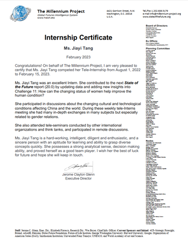 在The Millennium Project的实习过程中,唐佳怡同学主要完成了以下三项工作。第一,负责并完成了主题为“如何利用妇女地位的变化来改善人类状况?”这一部分的新闻稿更新工作。第二,每周发现一个“关键洞见”并进行深入思考和总结,在周会上与主管和来自世界各地的实习生交流讨论。第三,阅读主管提供的新闻稿和国际组织会议内容,挑选感兴趣或有困惑的部分与主管和其他实习生探讨学习,推动The Millennium Project日常工作的顺利开展。