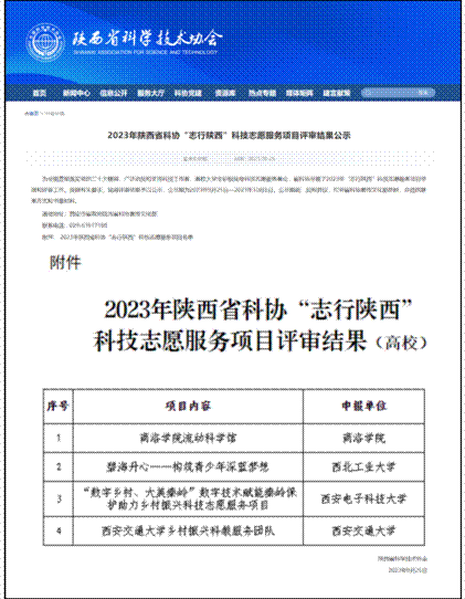 (通讯员 韩静)近日,陕西省科学技术协会发布《2023年陕西省科协“志行陕西”科技志愿服务项目评审结果公示》,共有6个项目入选,其中高校项目4个。2026世界杯官网“数字乡村、大美秦岭”——数字技术赋能秦岭保护助力乡村振兴科技志愿服务项目成功入选。