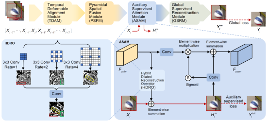 考率到转码压缩视频中存在的伪影是多次编码失真的叠加,先前的处理方案主要针对单次压缩损伤的修复,如图3所示,当其应用于转码视频上效果大打折扣。为此,结合实际应用场景,该论文将深度学习与转码视频去伪影任务相结合,利用转码视频特性,将初始编码信息作为中间辅助监督标签,设计辅助监督和全局监督损失函数引导网络训练。同时,该论文结合视频的时空相关特性设计了包括时域可变形对齐模块(TDAM)、金字塔空域融合模块(PSFM)等在内的卷积神经网络架构,并协同辅助监督(ASAM)和全局监督(GSAM)训练以更好地提升转码视频的画面质量,对应网络架构图见图4。因此,通过论文方法,可以在不增加视频码率的情况下大幅提高视频图像质量。表1以图像客观评价指标PSNR/SSIM增益作为客观评价指标衡量该论文方法较先前方法而言的增强性能提升程度。从