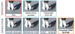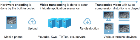 结合深度学习技术,何刚老师团队首次针对实际工程应用中视频经历多次压缩编码(即转码)而非独立压缩编码,开创性地开发相应的视频修复去伪影增强算法,并取得了显著成果。图2为转码视频压缩去伪影增强的一个应用场景示例,日常生活观看的视频大多数都在录制与传输过程中经历了多次编码压缩。通常情况下使用移动手机录制的视频通过互联网分享给其他人时视频至少会经过两次压缩。首先,在手机端录制的视频会直接经由手机内置的编解码器完成硬件编码(也称初始编码),此时的视频码率较高,视频内容清晰,压缩伪影不明显。然后用户将其上传到如YouTube、快手、抖音等视频服务提供商时,这些厂商将对视频进行不同码率的转码以适应不同的应用场景,而后分发给其他用户。最终在其他用户端显示播放的该视频是经过编码和转码后的版本,此时的视频往往失真明显,压缩伪影明显,尤其是在带宽有限的情况下更加突出,会不同程度地影响用户的观看体验。