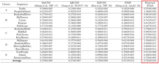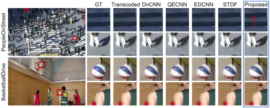 表中可以看出,该论文提出的方法在测试视频序列的平均PSNR增益为0.782dB,相比于先前方法STDF而言提升增幅达52.4%。同时,图5为与先前单次编码修复增强方法的主观效果对比图,可以看出该论文方案主观质量大幅提升,如转码损伤的斑马线被修复还原,行人周围的伪影得到大面积移除,篮球的边缘纹理修复重现等。因此,本论文无论从客观指标和主观效果上都极大程度地修复提升了视频转码压缩后的视觉质量。